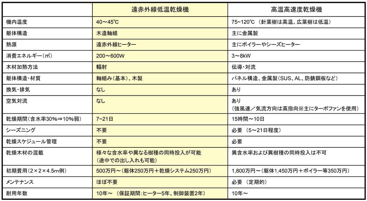 - 40〜45度の輻射主体乾燥なので、過乾燥しにくく、含水率の異なる材や、異なる樹種を同時に投庫・混載可能