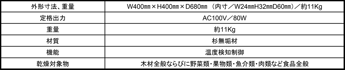 乾燥機容量:1m3|木積容量:0.3m3(300L)|最大出力:840W|最大カロリー:722Kcal